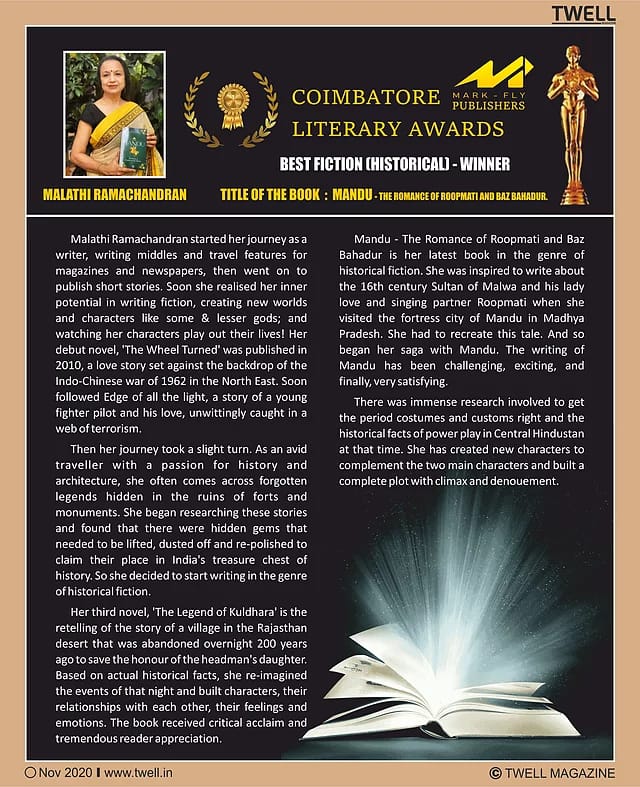 CLA Write-up |14 February 2021 Write-up in Twell magazine, November 2020 issue on the writing of award winning novel Mandu. Excerpt: "I often come across forgotten legends hidden in the ruins of forts and monuments. I began researching these stories and found that here were hidden gems that needed to be lifted, dusted off and re-polished to claim their place in India's treasure chest of history. For it is the human stories of love and joy, and suffering and loss, that lend another dimension to historical narratives. Mandu-The Romance of Roopmati and Baz Bahadur is my latest book in the genre of historical fiction.