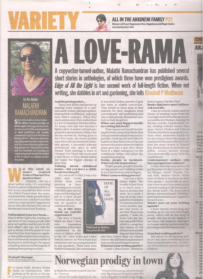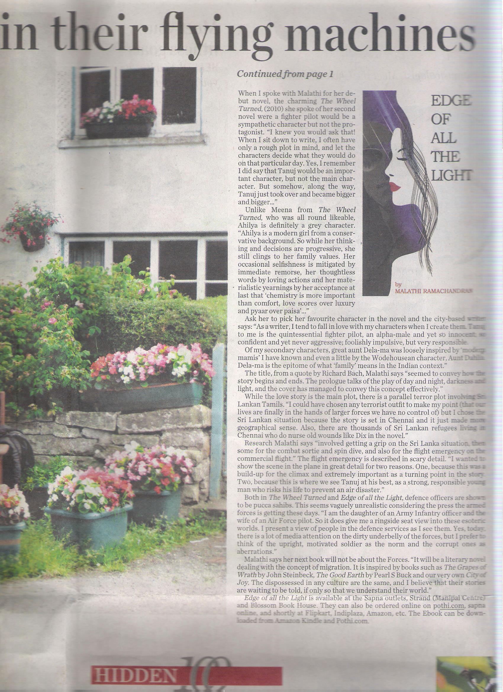 An interview in Bangalore Mirror, 2013, on the writing of Edge of all the Light. Click on pic to read the full interview.